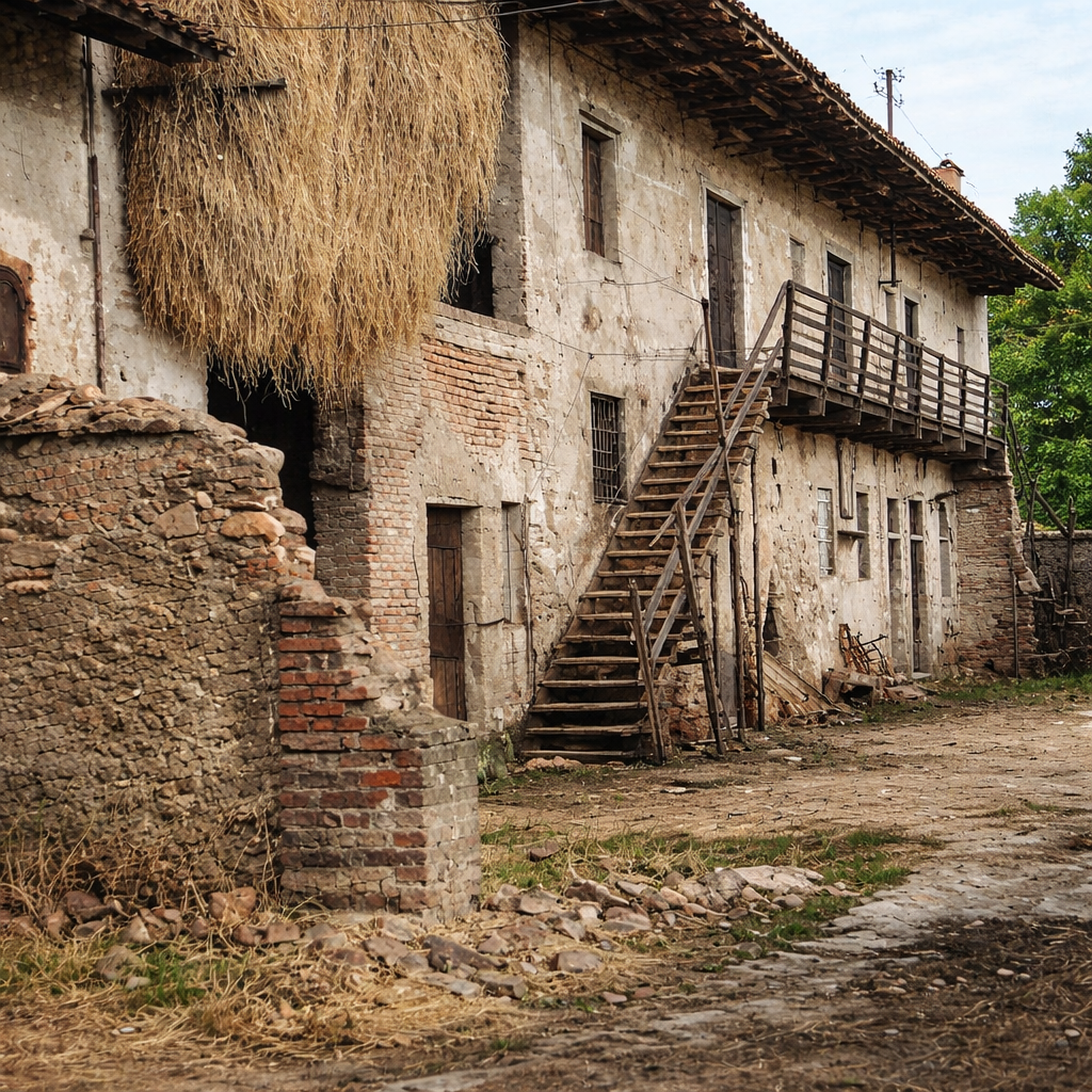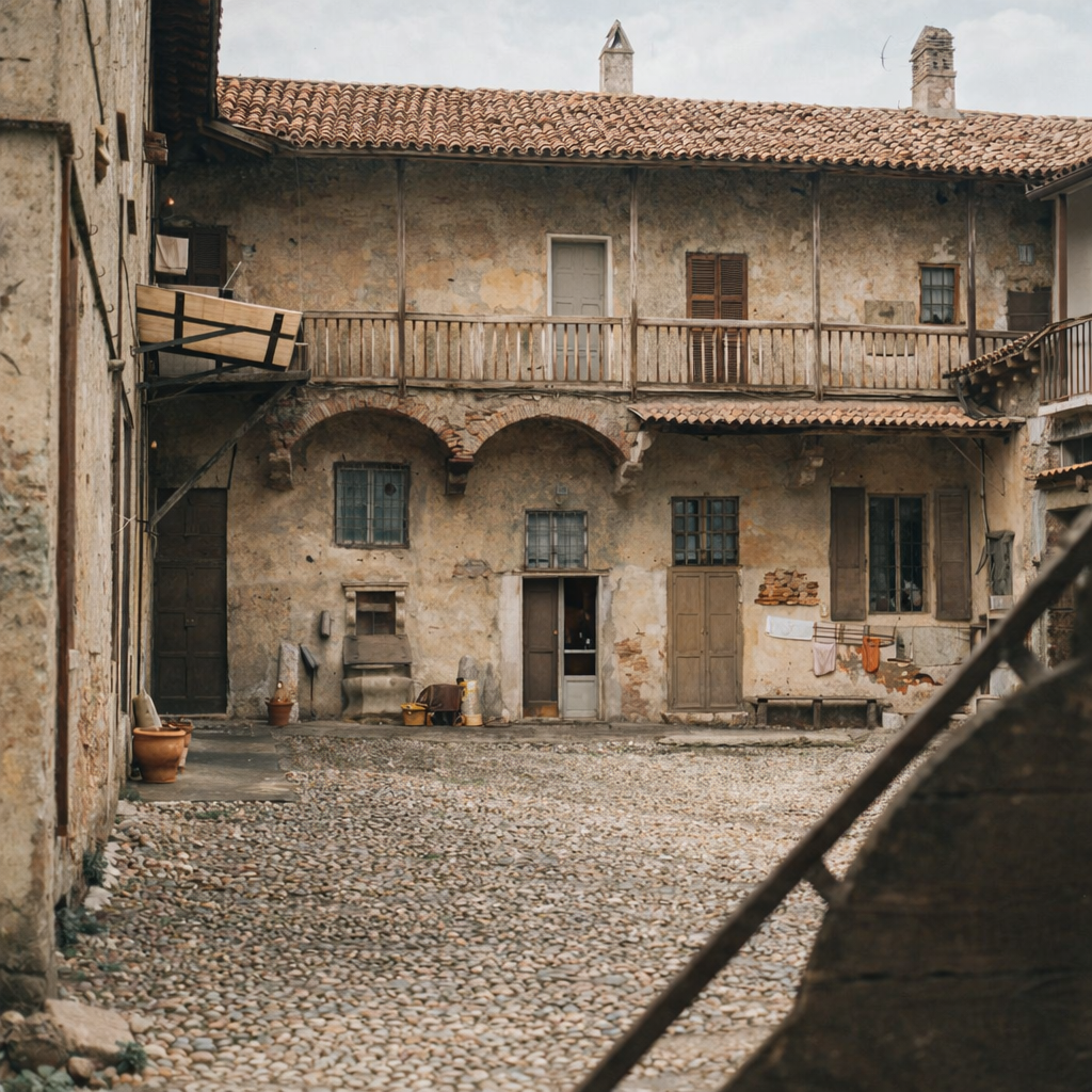 Cortile di contadini, è facile trovare ancora oggi qualche stalla ospitante un cavallo. Nel cortile è ancora visibile il pozzo da dove veniva attinta l'acqua